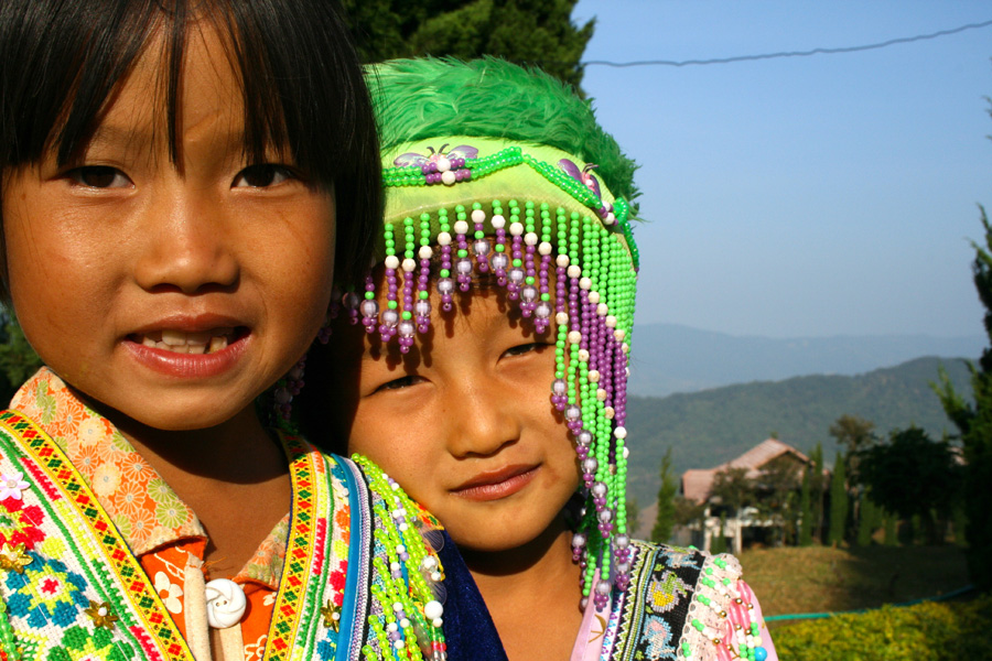 Das Foto zeigt zwei lächelnde neugierige Mädchen der Volksgruppe der Hmong (Meo), die bunte Trachten mit Perlen und Federn tragen.